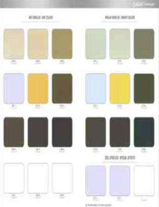 Düz Renkler, Metalik Renkler, Ahşap Desenler, Nano Yüzeyler, Taş Efektler, Mermer ve Granit Efektler, Paslanmış Efekt, Pütürlü Yüzeyler, Simli Yüzeyler, Prizmatik Renkler, Ayna ve Satine Yüzeyler üretilebilmektedir.